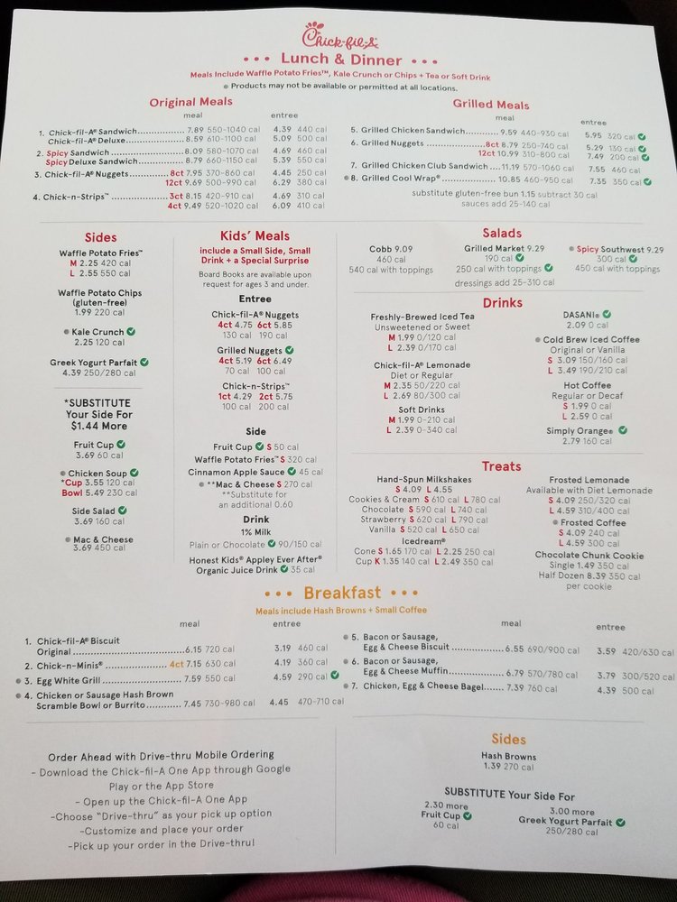 Includes a 4-count or 6-count of Chick-fil-A- GrilledNuggets, a choice of a small Side Item (Cinnamon Apple Sauce, Waffle Potato Fries-, or Fruit Cup), milk or juice, and a special surprise.