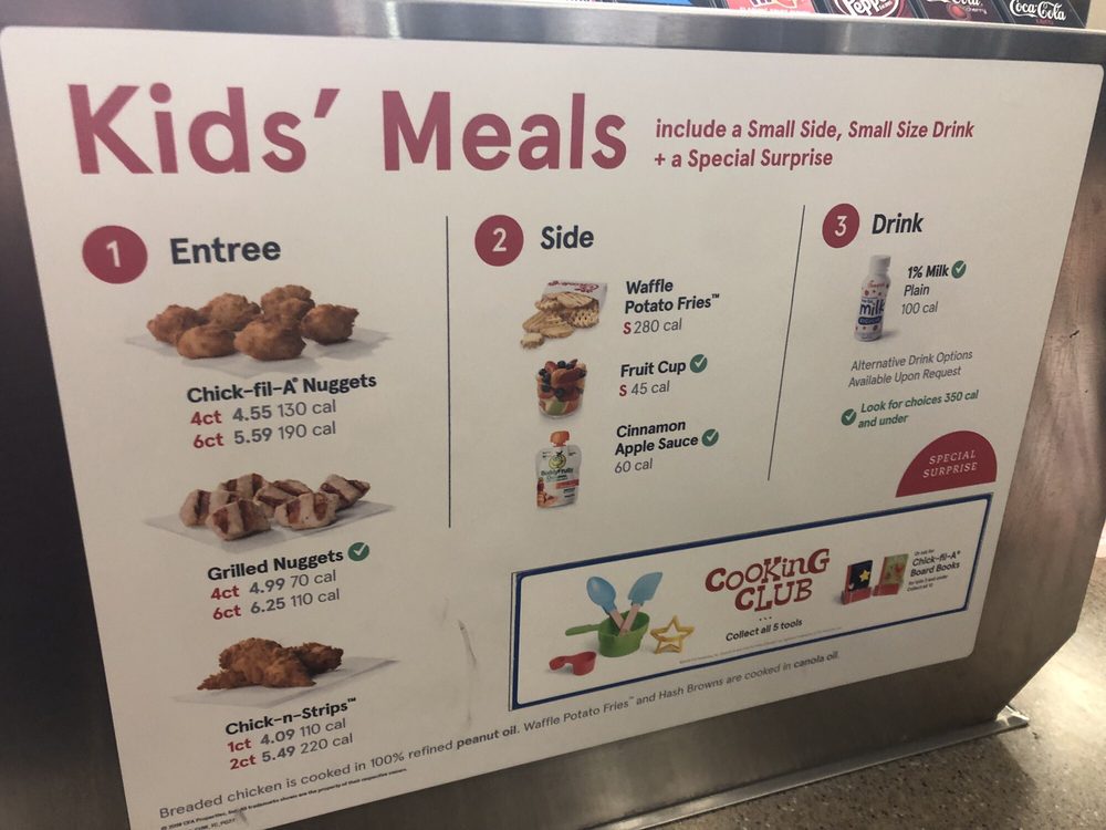 Includes a 4-count or 6-count of Chick-fil-A- Nuggets, a choice of a small Side Item (Cinnamon Apple Sauce, Waffle Potato Fries-, or Fruit Cup), milk or juice, and a special surprise.